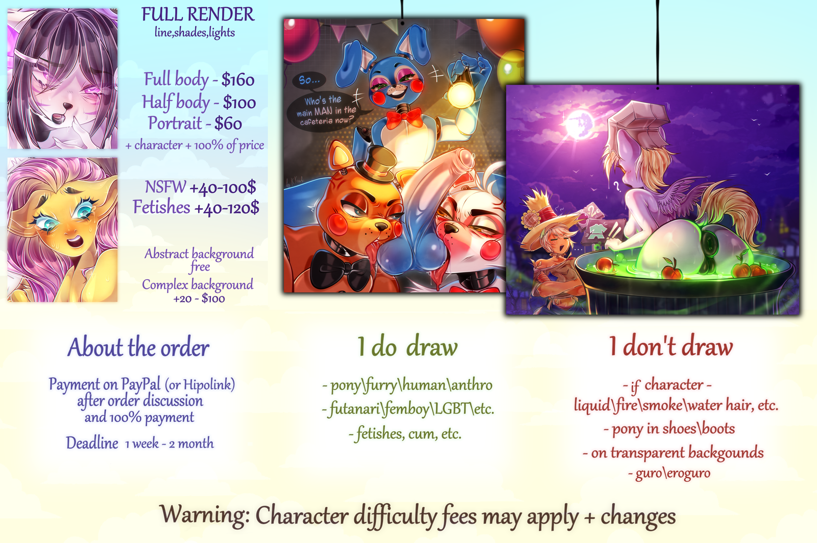 Complex characters, heavy edits, extra characters, detailed props or backgrounds may require an additional fee.