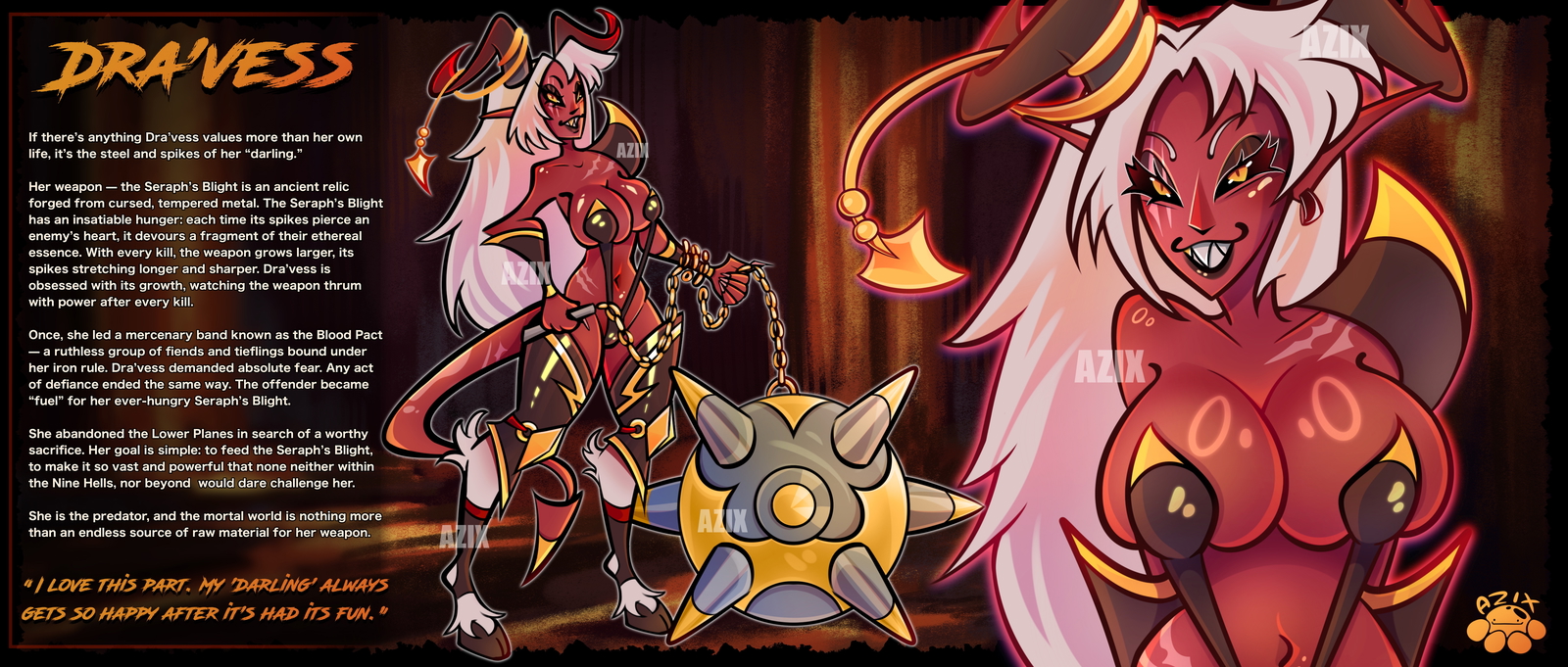 «Her weapon — the Seraph’s Blight is an ancient relic forged from cursed, tempered metal. The Seraph’s Blight has an insatiable hunger: each time its spikes pierce an enemy’s heart, it devours a fragment of their ethereal essence. With every kill, the weapon grows larger, its spikes stretching longer and sharper. Dra’vess is obsessed with its growth, watching the weapon thrum with power after every kill»