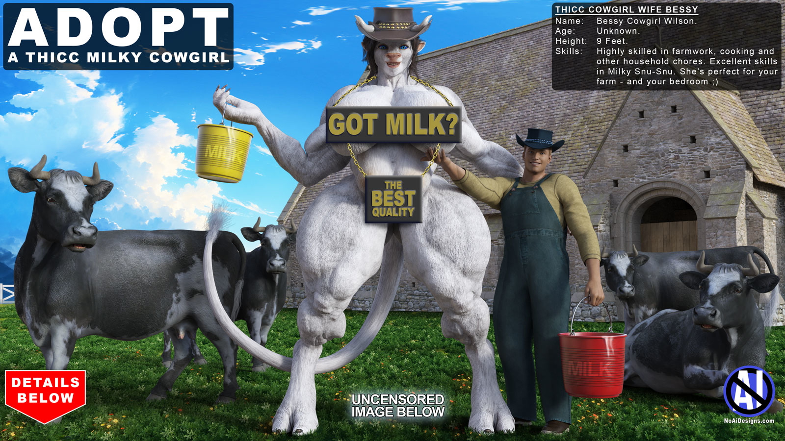 Hello everyone. This is V, from NoAiDesigns.com. I create CG content using Daz Studio, Blender and Photoshop (no AI tools needed). Today, I’m presenting your new, thicc, milky wife, Bessy Cowgirl Wilson.