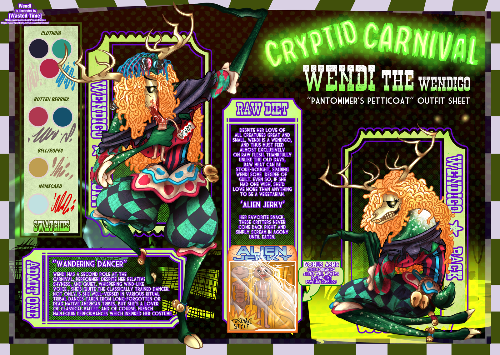Wendi is kind of a tragic character. She's a very sweet, soft-spoken hulking beast of a creature that loves animals and people. However, being a Wendigo comes with certain 'drawbacks' that often leave the good-natured ones to live incredibly lonely and solitary lives. On her 'Nude' sheet, I wrote a blurb about the land a Wendigo chooses to live on is always cursed with undeath. And while there were no corpses on Wendi's land in the carnival, she is a collector of hoax cryptids, which...tend to come to life while she's asleep. It was this curse that allowed Wendi to create the Cryptid Carnival 'Peting Sue' with the more 'people-friendly' critters that her curse raised. The savage or painfully broken hoax creatures, however, often end up in Wendi's diet, which raises another complication.