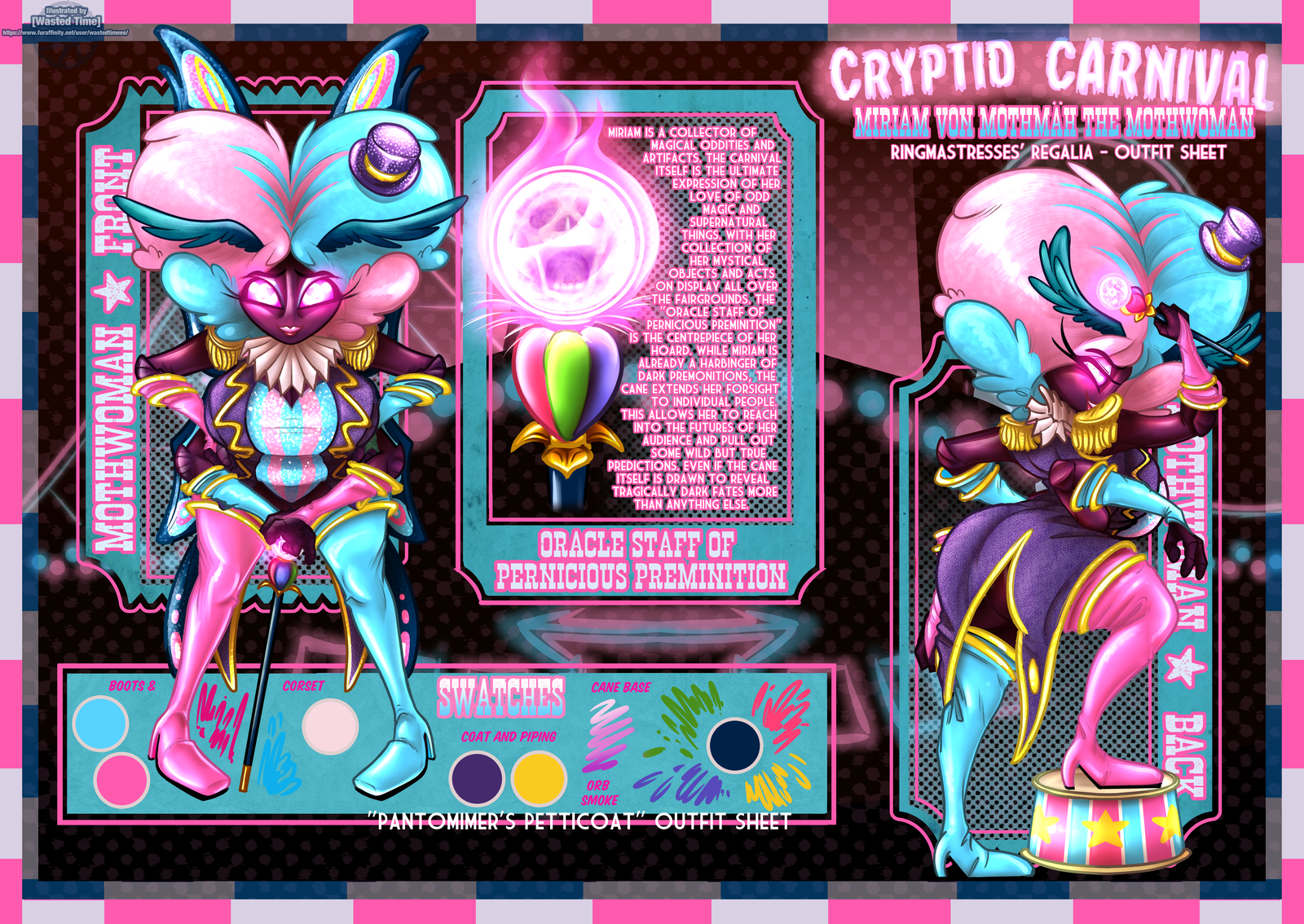 Aside from her wings, Miriam also has the gift of being able to see dark premonitions. Granted, these are very broad, like with the rest of her species. The feeling generally manifests with a vibe and a desire to flock to the location of the impending disaster, an impulse Miriam has trained herself to suppress. Moreover, she's done her best to refine that future sight into a fun parlor trick during her performances. But to further amplify her skill, Miriam also picked up a special cane that allows her to see into the future of specific members of the audience with deadly precision. Emphasis on the deadly, as the 'Oracle Staff of Pernicious Premonition ' is drawn to revealing the fates of those who will meet a most tragic end, more than anything else.