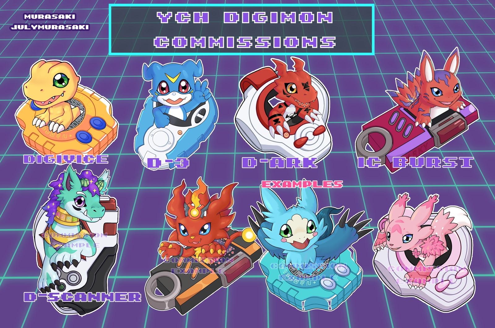You can choose one of these digivices: first digivice (Adventure), D-3 (Adventure 02), D-Ark (Tamers) , iC burst (Data Squad/Savers) or D-Scanner (Frontier) And the colors of your preference