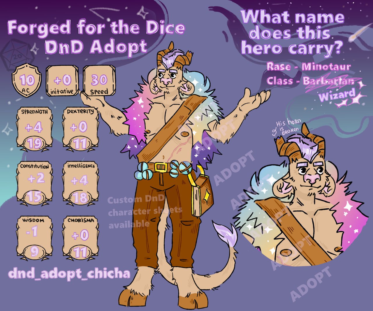 this star-blessed minotaur is a Circle of Stars spellcaster who channels ancient constellations through sheer presence and confidence. His mantle reflects the night sky itself, and when he casts, the stars answer.
