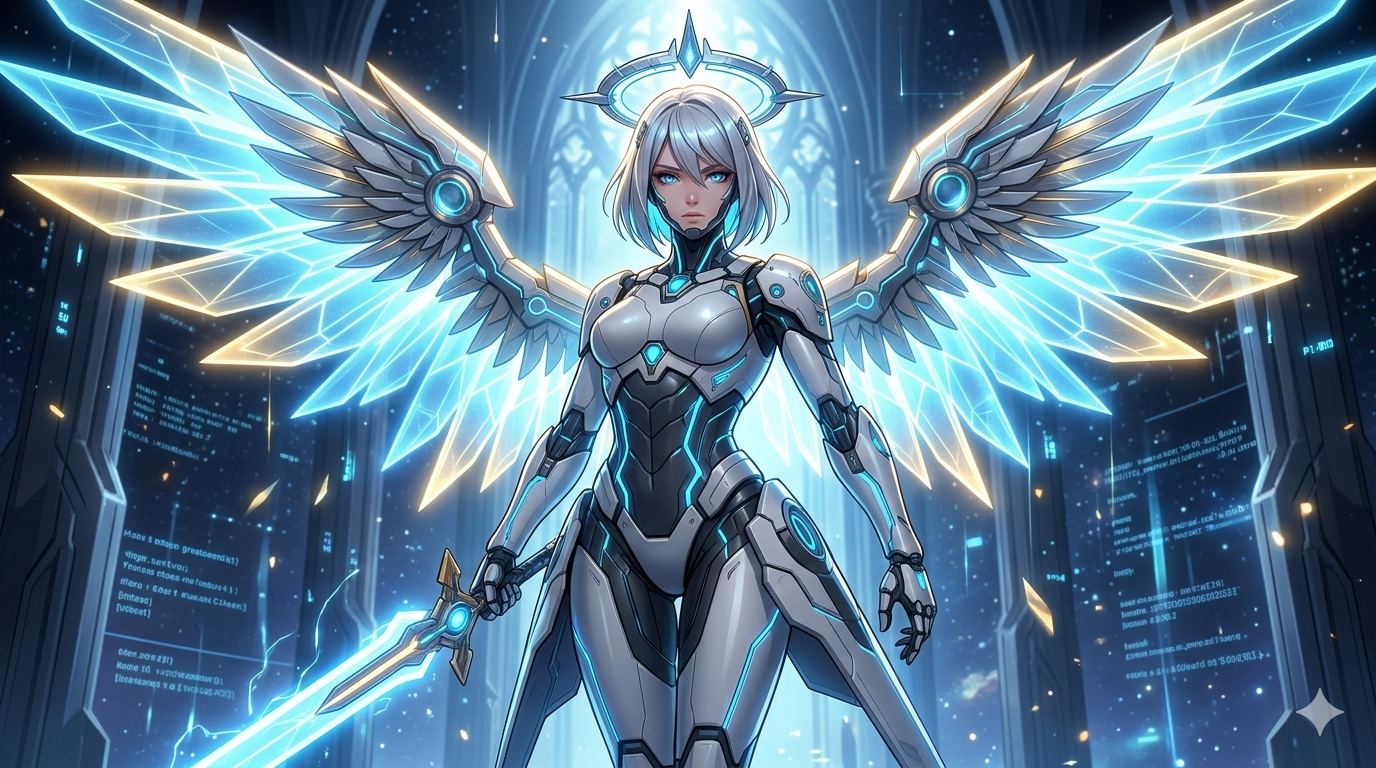 She is a divine fusion of celestial grace and cutting-edge cybernetic engineering. Designed to be a guardian of the digital heavens, her wings are crafted from high-output holographic energy.