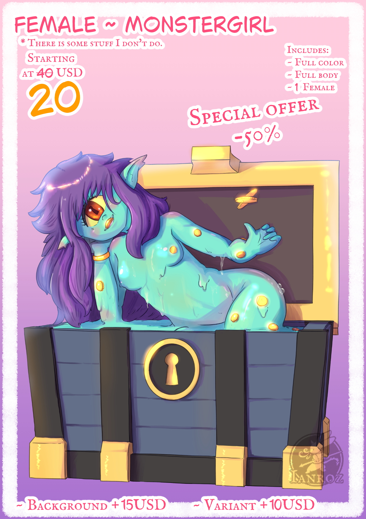 Check portafolio for more samples. If you have questions feel free to ask. Commission open for any fantasy girl, female OC or monster girl. I offer SFW and NSFW services. However, there are many stuff I DON'T DO in NSFW*.