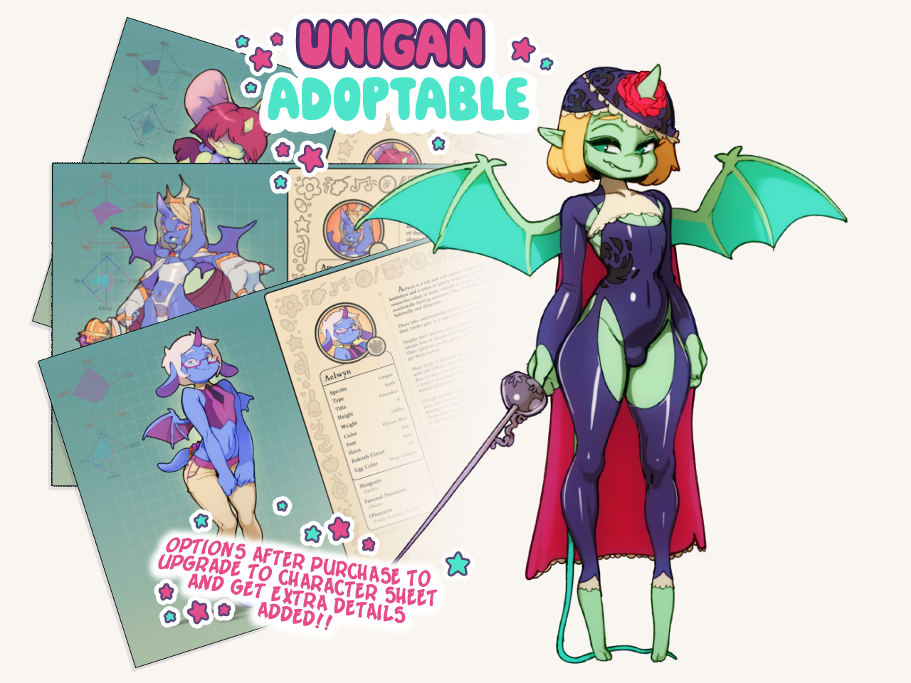 Upon auction completion I will send you an optional form to fill out if you’d like me to convert the adoptable into a character sheet and include any extra details (these will cost extra)!