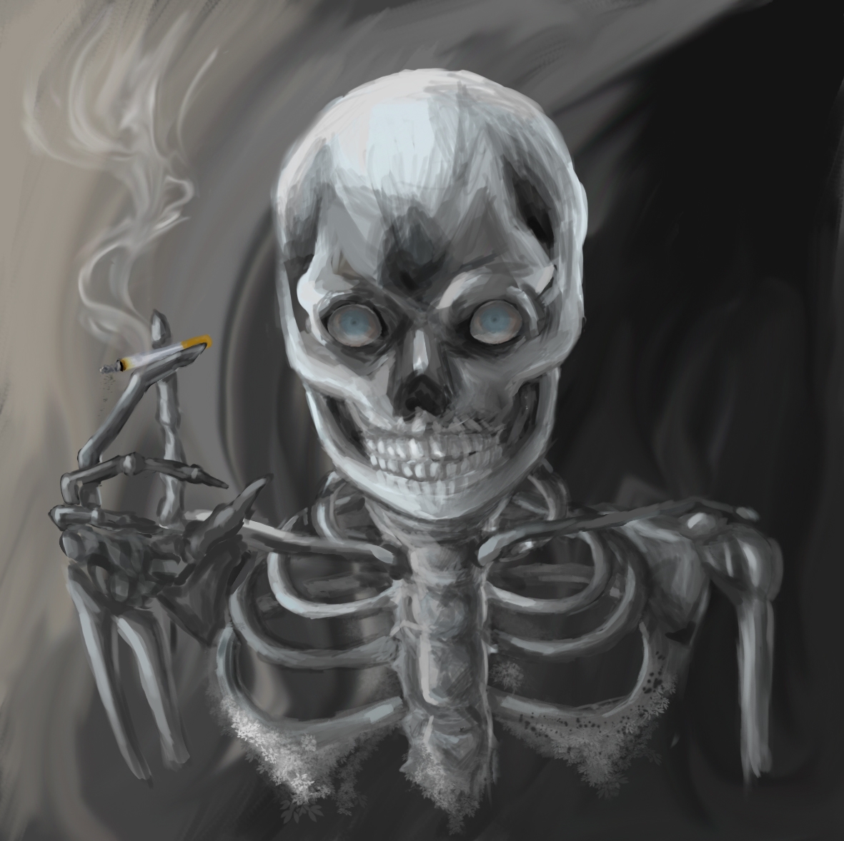 a skeleton with a cigarette